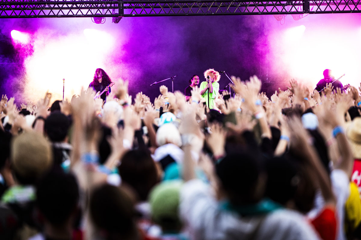 開口一番、「いくぞー!」と、長崎での"はじめまして"はメロウで、どことなくシティポップ味のある『恋風邪にのせて』。会場すべてに目を凝らしながら、柔らかく心地好い歌声が丘の上まで包んでいる。続けて『そんなbitterな話』ではスタンドマイクで甘いパフォーマンスを見せながら、サビではキラキラした眼差しのオーディエンスとの大合唱と歓声が止まらない。出だしのベースの音が鳴り出すと悲鳴の様な歓声が上がり、『踊り子』。言わずもがなみんなが待っていた曲の1つで、シンプルな音に思わず惹き込まれる"とぅるるる"という癖になるメロディが聴く者を夢中にさせ、さらに会場の温度を上げてからの、スローでエモーショナルな『しわあわせ』。じっと聴き入るオーディエンスがとても多いなか、曲が刺さり泣いてる人もちらほらと…。