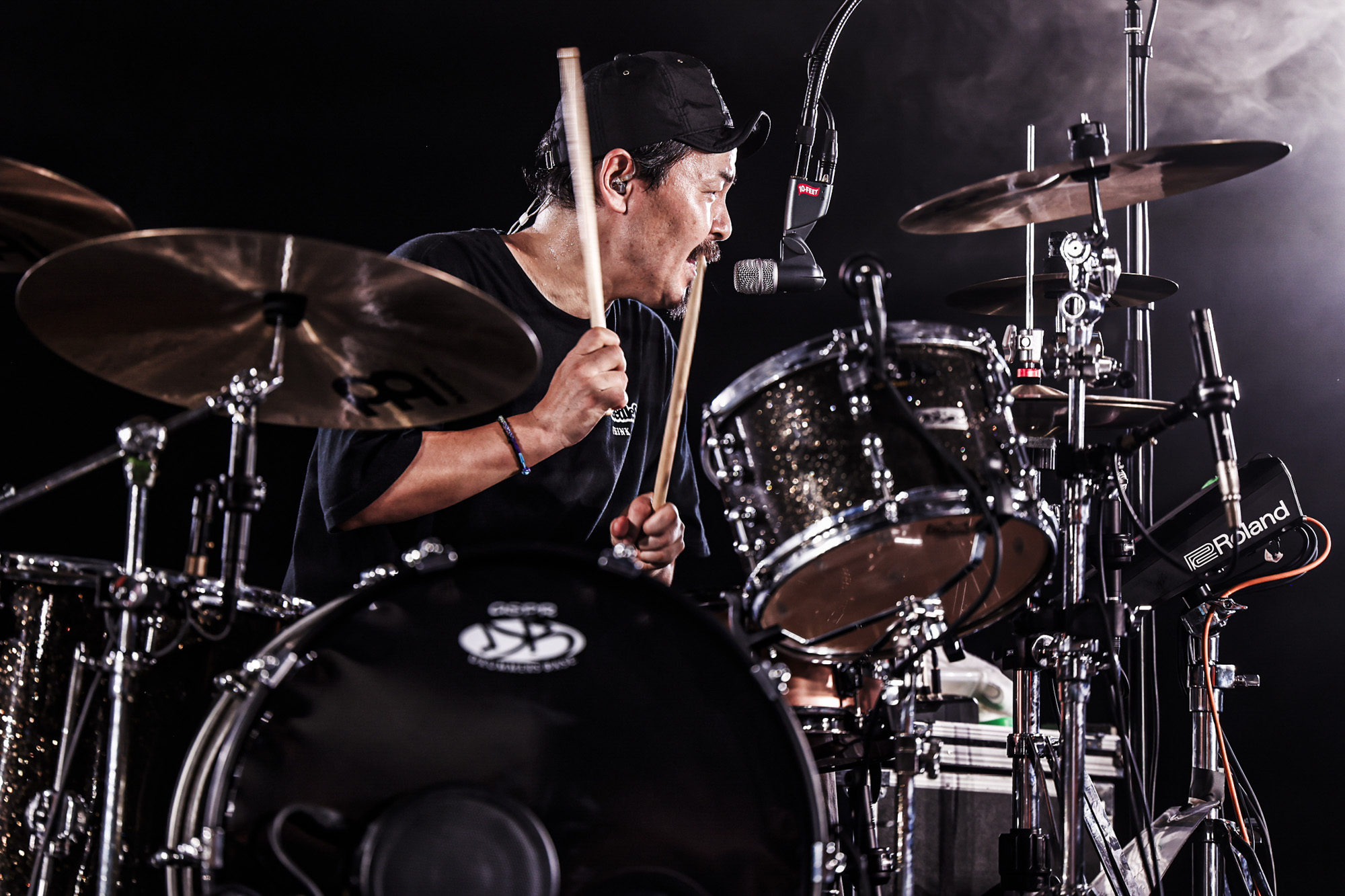 話は移り、≪Vo. / Gt.≫TAKUMA 「さっきTOSHI-LOWくん(BRAHMAN)、俺らが一昨日のフェスで時間押したって(※BRAHMANのライブレポート参照)言ってたけど、俺ら押したの15秒だけやんな。だから今日は袖でBRAHMANの時間を図ってたんだけど、1分40秒押したから(笑)。しかもそのフェスで、あのインチキ鬼は自分らのとき、さっき10-FEETが15秒押したから俺ら3曲削ってますって(笑)。めちゃめちゃ責任感を感じさせようとしてくるのよ、あの鬼は。で、押したことをそんなに怒ってんのかなって思って確認したら "15秒押してくれてありがとう、おいしかった"って(笑)。それと13年前の海に放り込んだくだり(※BRAHMANのライブレポート参照)あったやんか、それで(スカジャンに)出れんくなったってヤツ。俺、真横で見てたのよ。俺は自分から飛び込んでく方やったからTOSHI-LOWに放り込まれんかったんやけど、みんながどんどんUFOキャッチャーみたいにTOSHI-LOWに海へ放り込まれってって。そんときの打ち上げがDragon AshのKjとTOSHI-LOWは初絡みだったんよ。KjともTOSHI-LOWとも仲良いの俺くらいだったから、"これは今日は忙しいぞ"て思っててん(笑)。ほんなら海にTOSHI-LOWがKjを放り込もうとした途端、Kj、自分から飛び込んでったんよ。よっぽどTOSHI-LOWのことが嫌やったんやろうな、ちょっと沖の方まで泳いで逃げてん(笑)。沖の方まで行ってたらTOSHI-LOWが自ら飛び込んでKjのとこまで背泳ぎ気味に寄っていきよって。俺、近くにいたらKjにしか聞こえないくらいの声のデカさで"Kj一緒にバンドやろうぜ"って(笑)。あれから13年経ってるじゃないですか、あかんかったんやろなっていう(笑)。」